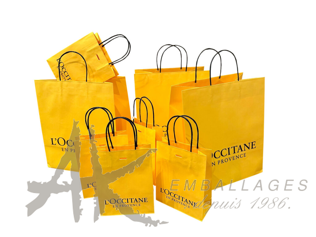 Le papier est blanchi selon un procédé sans chlore (ECF ou TCF), assurant un support recyclable et biodégradable tout en conservant une surface homogène et une blancheur régulière. Les poignées en papier torsadé sont fixées par collage renforcé, permettant une répartition optimale des contraintes lors du port et une bonne tenue en charge.